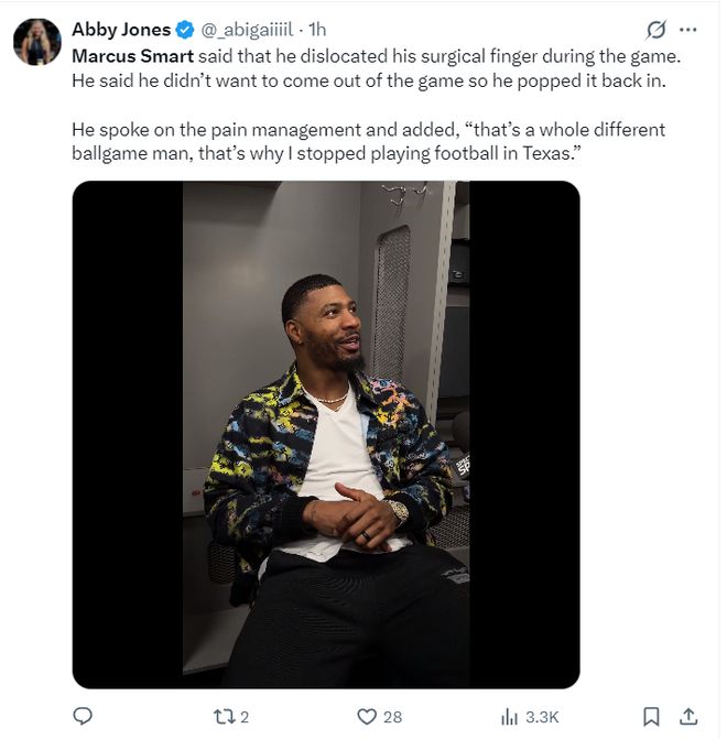 賽後斯瑪特在接受采訪時說:第四節在一次破壞球權時自己的右手食指脫臼了,為了自己不被換下場繼續幫助球隊我隻好自行掰正複位,自己的右手食指曾經是動過韌帶修複手術的。
