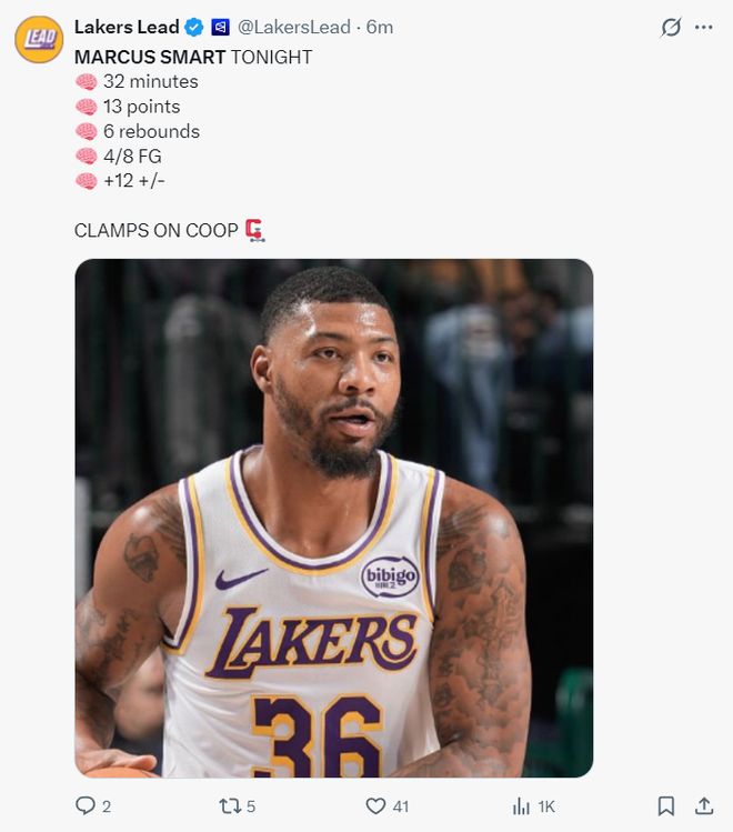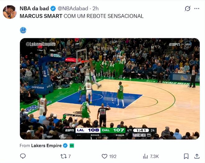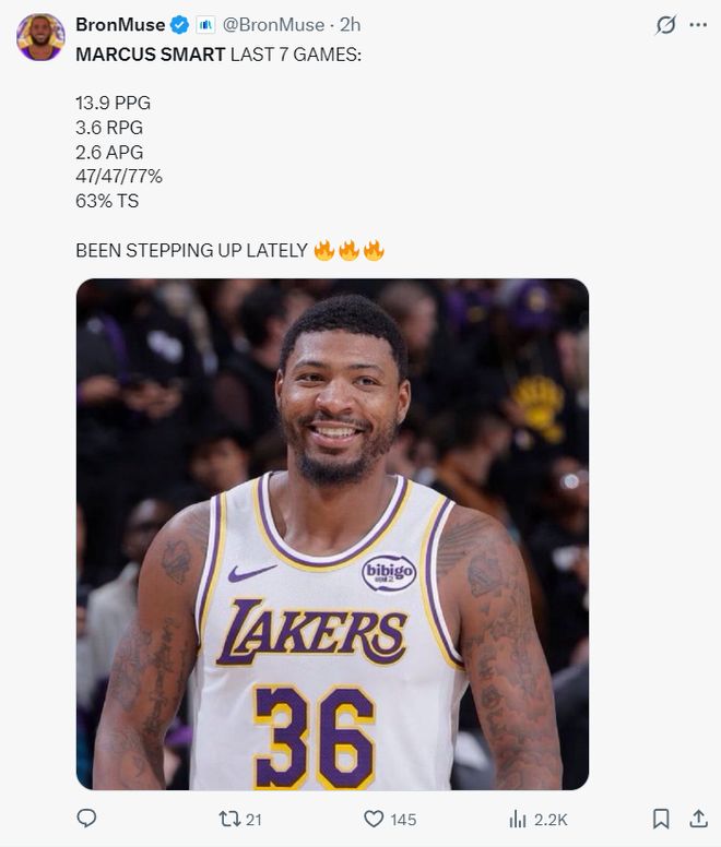 隨後在詹姆斯上籃偏出時斯瑪特從天而降完成補籃,這一球後湖人再度領先到3分,末節斯瑪特拿到7分4籃板1助攻1蓋帽(5中2+罰球5中3)。