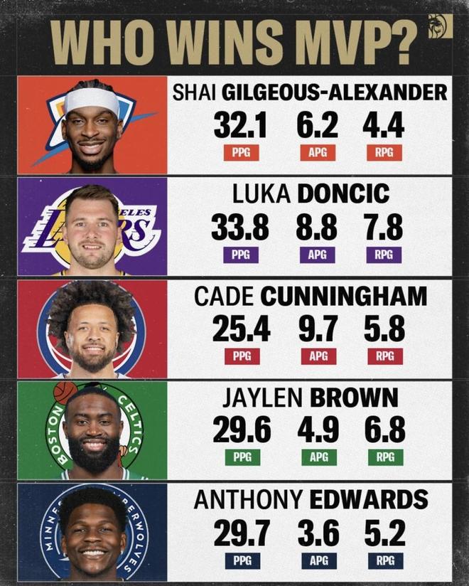他的場均25.4分不算最炸,但9.7次助攻說明他在球隊進攻裏是絕對發動機。問題也擺在桌麵:在同一張榜單裏,他的得分體量和那兩位30+的候選差得明顯。活塞如果繼續站在東部第一,他會一直有位置;但要衝到最終得主,個人端通常需要更接近“聯盟最頂級輸出”的存在感。