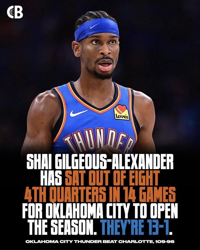 這樣一來,在開季拿下8連勝後,雷霆隊又拿下5連勝,開季前14場比賽拿到13勝1負傲人表現,繼續以絕對優勢領跑排行榜,期間唯一輸掉的一場比賽是背靠背第二場因為體能問題2分惜敗給強調快速攻防轉換節奏的開拓者。
