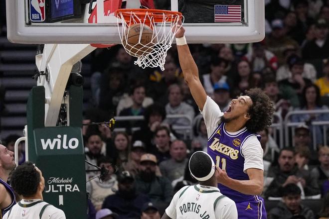下半場易邊再戰,第三節上來字母哥先籃下殺一個,東契奇造犯規罰球,裏夫斯也強硬打進。但場上風雲突變,格林三分三連擊,雄鹿打了一波15-0的小高潮追到16分。東契奇罰球止血,然後艾頓連續吃餅又把分差拉開到了20分以上,雄鹿暫停。暫停以後,字母籃下繼續翻江倒海,裏夫斯中投回敬以後,格林第5記三分!東契奇和字母各自造犯規罰球,字母哥籃下連續打進,安東尼搶斷以後,波蒂斯反擊追到隻差14分。東契奇連續兩記三分外加一個拋投,連得8分穩定軍心。三節結束湖人92-72領先20分。