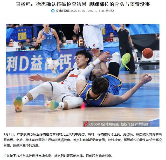 那麽,徐傑的傷情到底怎麽樣了呢?1月2日上午10點多,根據直播吧報道,徐傑親自確認了自己的傷情,經過檢查,腳踝部位的骨頭與韌帶都沒有事。看來,真的是虛驚一場了。