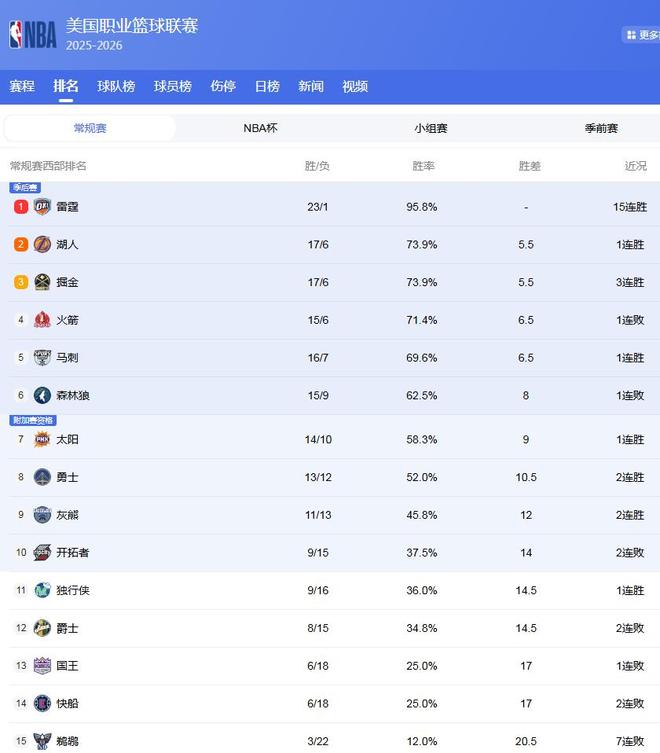 NBA25-26賽季常規賽正在如火如荼的進行,本賽季的西部,形勢發生了不小的變化!雷霆獨霸榜首,湖人、掘金、火箭、馬刺難分上下,4隊差距僅1場,搶奪西部第2;森林狼、太陽是進入季後賽的中堅力量,勇士第8則難保,灰熊一直在搶奪;快船則是越輸越輸,球隊想進入附加賽都懸了,這也導致西部排名大變臉:差距僅1場,4隊搶2;灰熊直追勇士,快船附加賽懸了!