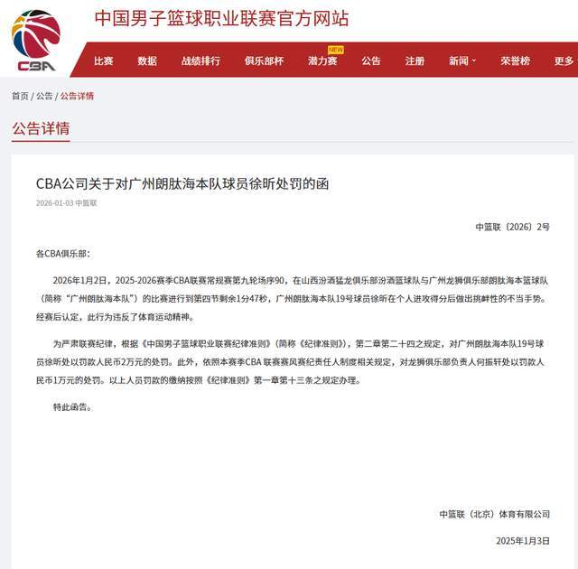 賽後,徐昕的這一挑釁行為,也是備受外界矚目,紛紛猜測,徐昕會遲到罰單的。果不其然,在1月3日深夜,這張罰單真的來了。從CBA官方信息來看,CBA公司認定徐昕在個人進攻得分後做出挑釁性的不當手勢,此行為違反了體育運動精神,決定對其處以人民幣2萬元的罰款。