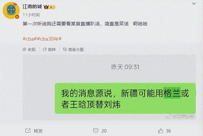 據媒體人“江南的城”透露,新疆男籃目前有兩個選擇,外教格蘭,本土教練王晗。