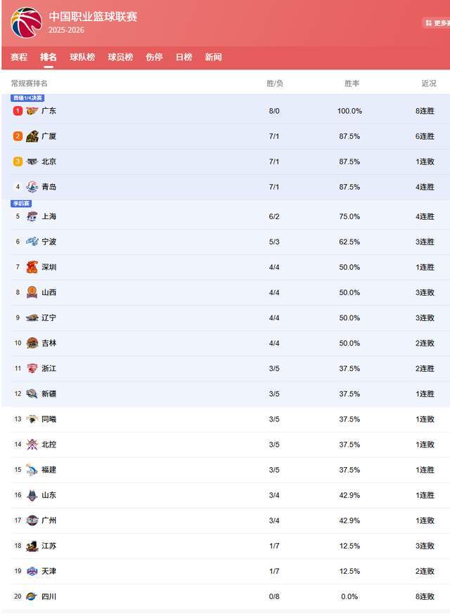 12月30日,隨著CBA常規賽第8輪全部戰罷,各隊之間的競爭愈發激烈,積分榜的排名也漸趨明朗。廣東男籃客場輕鬆大勝天津隊,8連勝高居第一,成為全聯盟唯一一支未嚐敗績的球隊,可謂獨孤求敗。黑馬青島男籃居然高居第4位,和廣廈北京並駕齊驅。四冠王遼寧男籃就有點慘了,排名直接掉出了前8名。山東男籃大勝山西隊之後,排名也是連升3位。