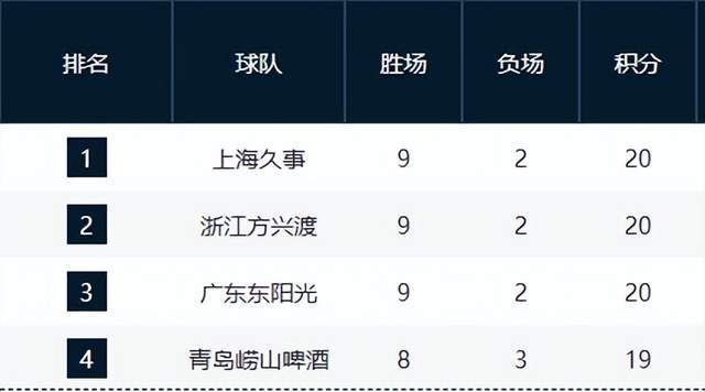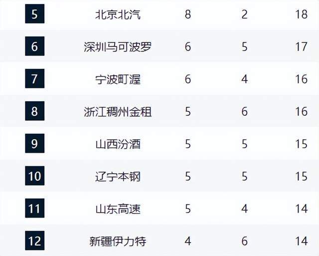 積分榜中遊,深圳隊6勝5負升至第六,寧波隊6勝4負少賽一輪暫列第七。浙江隊經曆賽季初低迷後漸入佳境,本輪爆冷絕殺廣東隊,戰績變為5勝6負,排名升至第八。遼寧隊作為四冠王,排名下滑至第十,戰績5勝5負,狀態亟待調整。