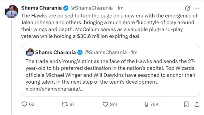 根據Shams的說法,老鷹這一舉動是因為新鷹王傑倫-約翰遜的崛起,老鷹管理層看到了一眾年輕球員的未來,特雷楊尺寸不足與防守短板已經不適合這支身高臂長具有運動能力的球隊,27歲正值當打之年的全明星後衛特雷楊的老鷹時代結束了。