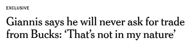 字母哥:沒錯,絕對不會。我全身心投入,一心撲在籃球事業上,和球隊並肩作戰,接受當下的一切處境。僅此而已。在這個世界上,我永遠不可能放棄我的球隊。這不是我的本性。