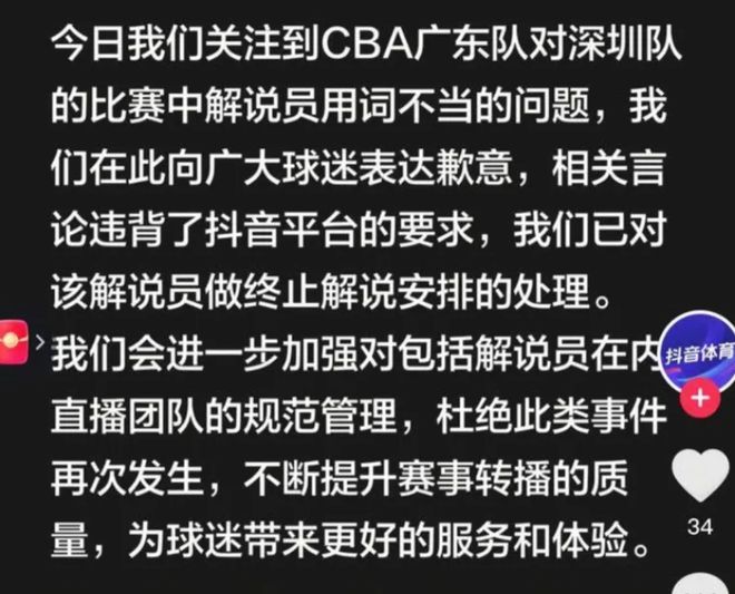 顯然,這就是這個解說在搞地域黑那一套,憤怒的廣東球迷馬上開始投訴,抖音也是在當晚反應迅速,立即解雇了這個解說,並且公開道歉。要知道,廣東的主場不僅僅有廣東人,還有很多從北方來打工的人,因此這個解說是把全國人民都罵了一遍,自然是要向廣大球迷進行道歉。