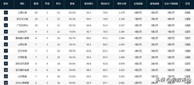 第一檔球隊當中,除了北京主場不敵山東,輸掉了三場比賽外。剩下三支球隊都是10勝2負。