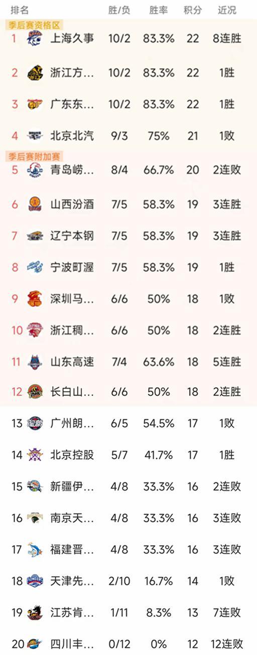 深圳、浙江稠州和吉林的戰績都是6勝6負積18分、山東的戰績是7勝4負,近期迎來一波5連勝,他們找回了上賽季的防守強度,由於少打一輪暫列第11名。廣州和北控都是積17分,暫列第13和第14。新疆、南京和福建的戰績是4勝8負積16分暫列第16-第17名,天津2勝10負排第18,江蘇1勝11負排第19,四川是唯一沒有勝場的球隊遭遇12連敗。