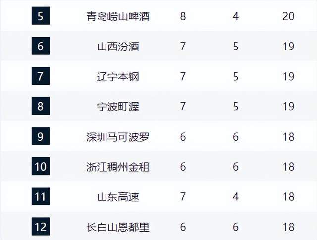 12輪戰罷,上海、廣廈和廣東三支球隊以10勝2負的戰績並列榜首,其中上海隊憑借八連勝的強勢表現暫時占據頭名位置。這三支球隊展現出的穩定性令人印象深刻,上海隊在擊敗青島的比賽中展現出強大的整體實力,廣廈和廣東則通過關鍵勝利鞏固了爭冠集團的領先優勢。