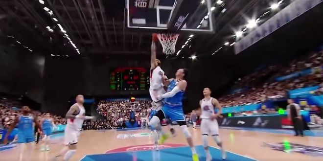 周琦對於這個防守的預判晚了,眼睜睜地目送對方暴扣。