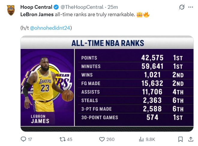 全場比賽詹姆斯21中10+三分7中2,拿到26分10助攻9籃板3搶斷,命中率47.6%。美媒HC曬出勒布朗八項數據再讚偉大,這八項數據裏勒布朗有三項是第一,