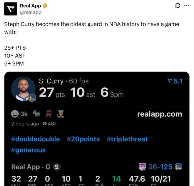 憑借這樣的表現,37歲302天的庫裏成為NBA曆史上單場砍下至少25分10助且命中至少5記三分最年長的後衛。
