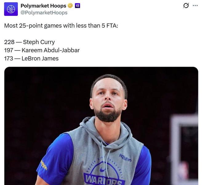 同時這是庫裏生涯第228場在罰球少於5次的情況下,單場至少拿下25分,繼續高居NBA曆史第一,賈巴爾以197場排在第二,詹姆斯173場排名第三。