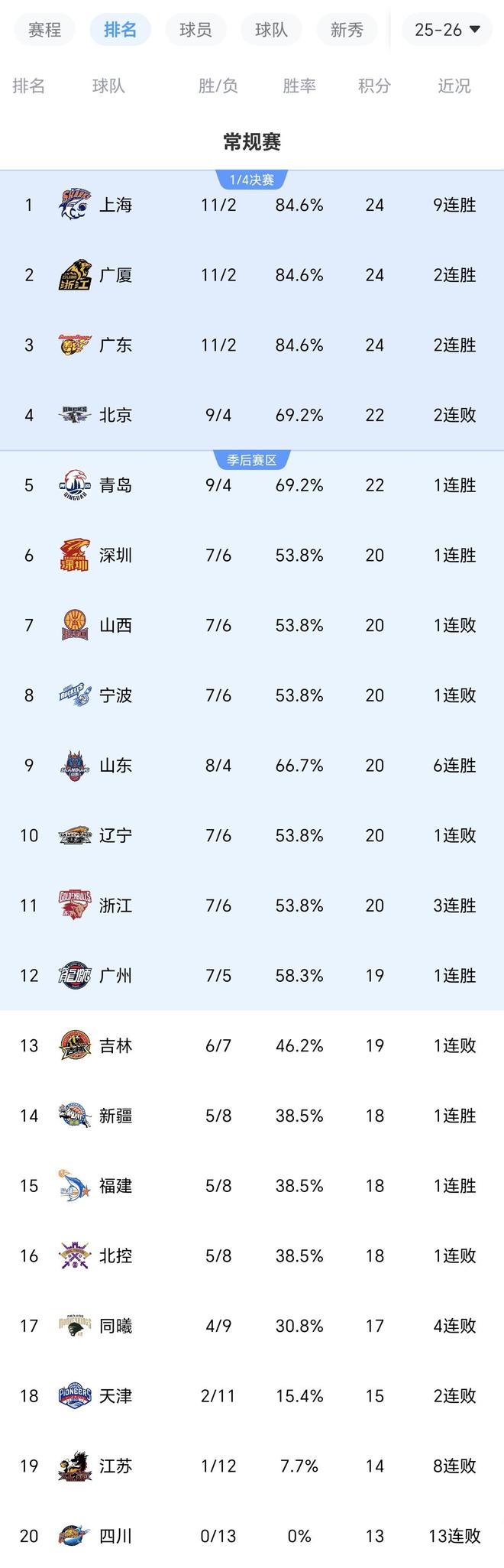 北京時間1月11日晚上,CBA常規賽第十三輪迎來多場比賽,總共六場,遼寧男籃慘敗廣東男籃、山東男籃大勝同曦男籃、上海男籃大勝山西男籃、深圳男籃擊敗北京男籃、寧波男籃輸給廣廈男籃、吉林男籃不敵青島男籃,上演狂歡一夜。
