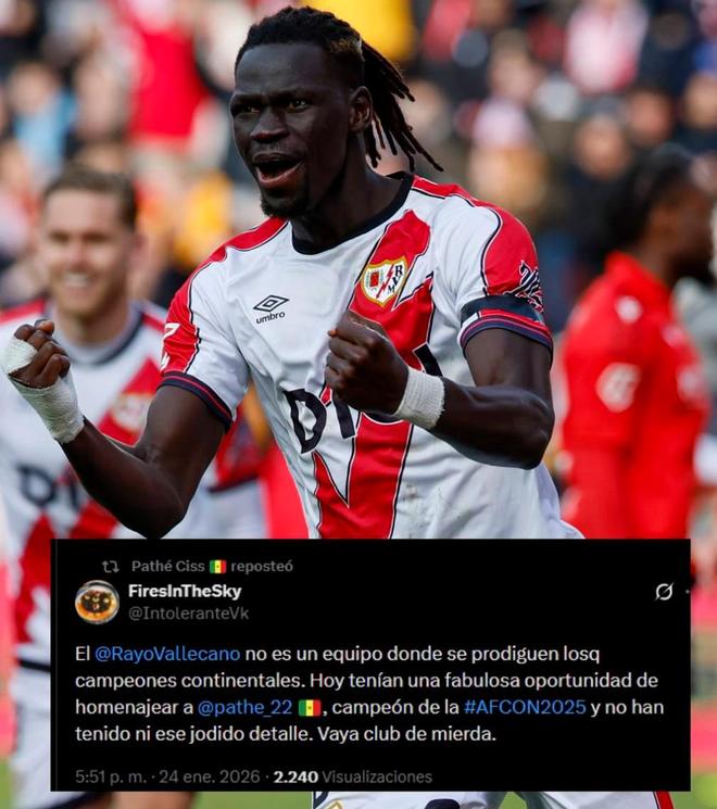 報道稱,盡管這位塞內加爾球員未就此事發表正式聲明,但西斯通過社交媒體表達了不滿。西斯用其認證賬號轉發了一條推文,內容寫道:“巴列卡諾並不是一支常出洲際冠軍的球隊。今天他們本有絕佳機會向非洲杯冠軍西斯致敬,卻連他媽的這個細節都沒做到。真是個垃圾俱樂部。”
