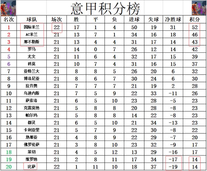 積分榜方麵,國米逆轉大勝比薩之後,先賽的他們領先第2的AC米蘭6分,多第3的那不勒斯9分,繼續坐穩榜首位置。比薩遭逆轉慘敗後,淨勝球劣勢,換掉維羅納,成了新的副班長。