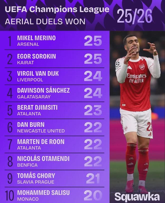 Squawka統計,本賽季歐冠至今為止爭頂成功次數最多(並列)的球員是梅裏諾:25次。