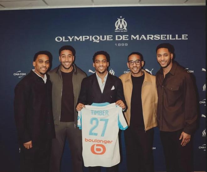 廷貝爾的兄弟昆滕-廷貝爾簽約馬賽,阿森納球星也出現在了簽約現場。