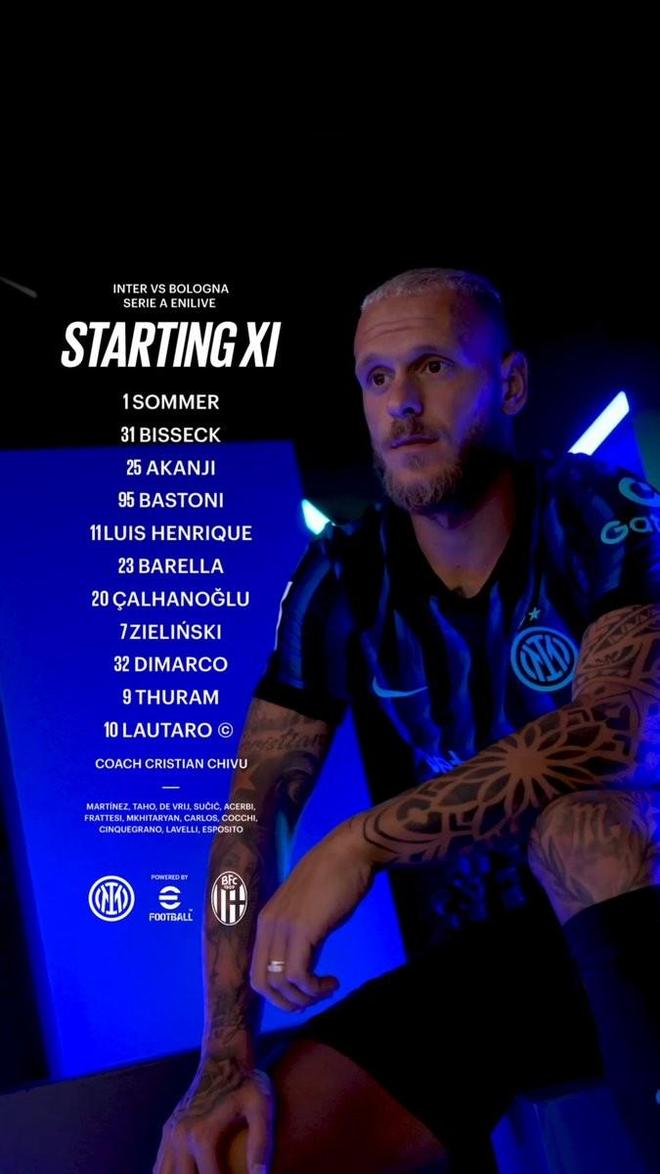 國米首發:1-索默、31-比塞克、25-阿坎吉、95-巴斯托尼、11-路易斯-恩裏克、23-巴雷拉、20-恰爾汗奧盧、7-澤林斯基、32-迪馬爾科、9-圖拉姆、10-勞塔羅
