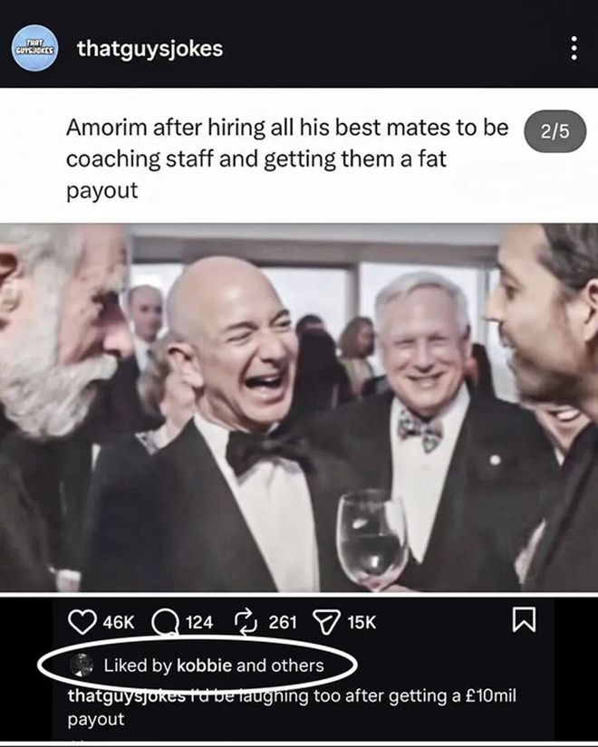 在曼聯解雇前任主帥魯本·阿莫林之後,20歲的英格蘭中場科比·梅諾在社媒點讚了一條嘲諷阿莫林貪財的帖子。該網文嘲諷阿莫林帶著自己的教練組到曼聯,然後主動造成被解雇,以便得到豐厚的補償。