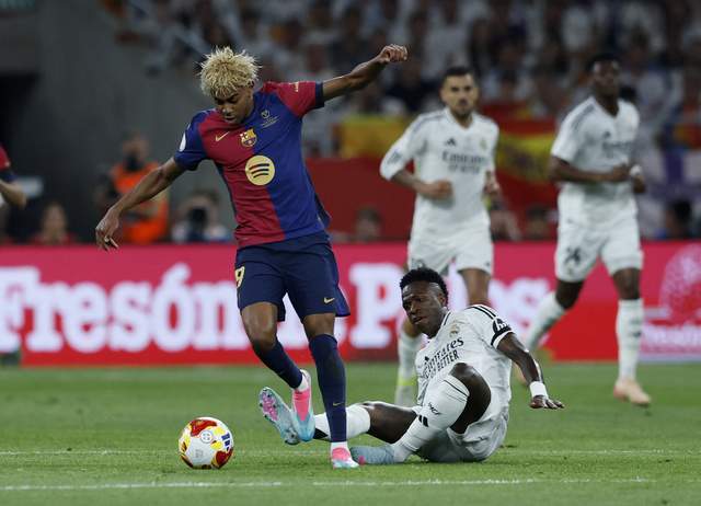去年1月的西超杯,巴薩2-0戰勝畢爾巴鄂競技,皇馬3-0輕取馬洛卡,決賽連續3年上演國家德比對決。這場決賽打得極為精彩,亞馬爾、萊萬、拉菲尼亞(2球)的三叉戟破門,巴爾德打進1球,皇馬則由姆巴佩、羅德裏戈破門,巴薩5-2大勝。