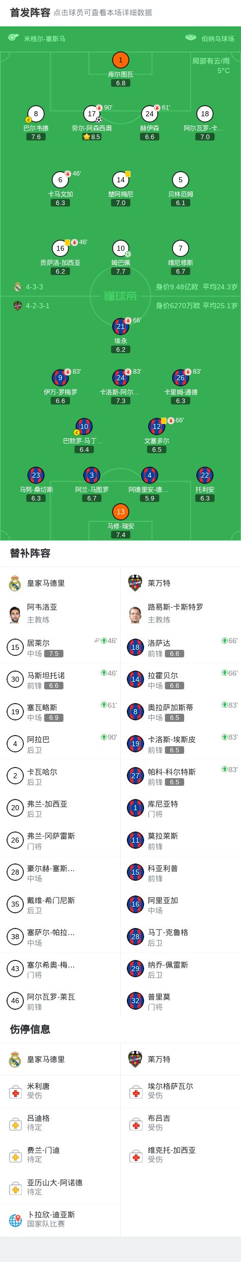 第46分鍾,皇馬換人調整,馬斯坦托諾、居萊爾替補登場
